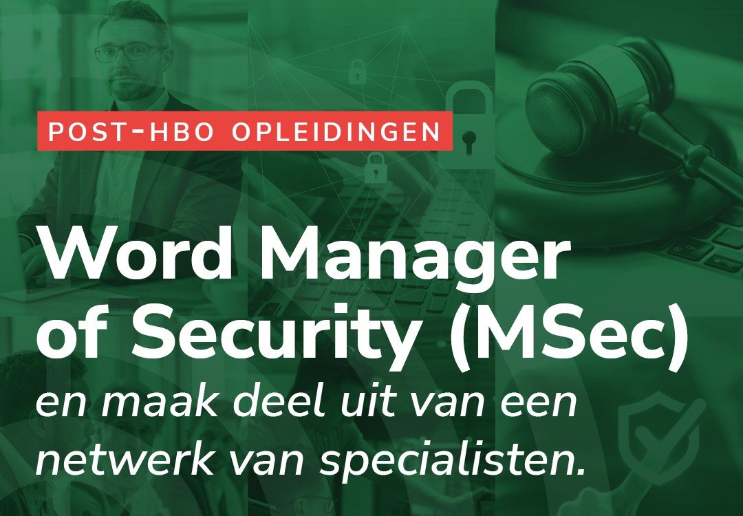 Je leert een integraal veiligheidsplan opstellen voor de fysieke beveiliging van een organisatie en kunt optreden als volwaardig gesprekspartner over beveiliging gerelateerde onderwerpen.   >> Start 16 september   Word manager of security (MSec)Het succesvol afronden van bovenstaande Post-HBO Registeropleidingen DHM Security Management®, Security Techniek (SecTec) en Security en Recht is een van de vereisten om de titel MSec, Manager of Security van stichting @SERN te voeren. Het maakt niet uit in welke volgorde je de opleidingen volgt.